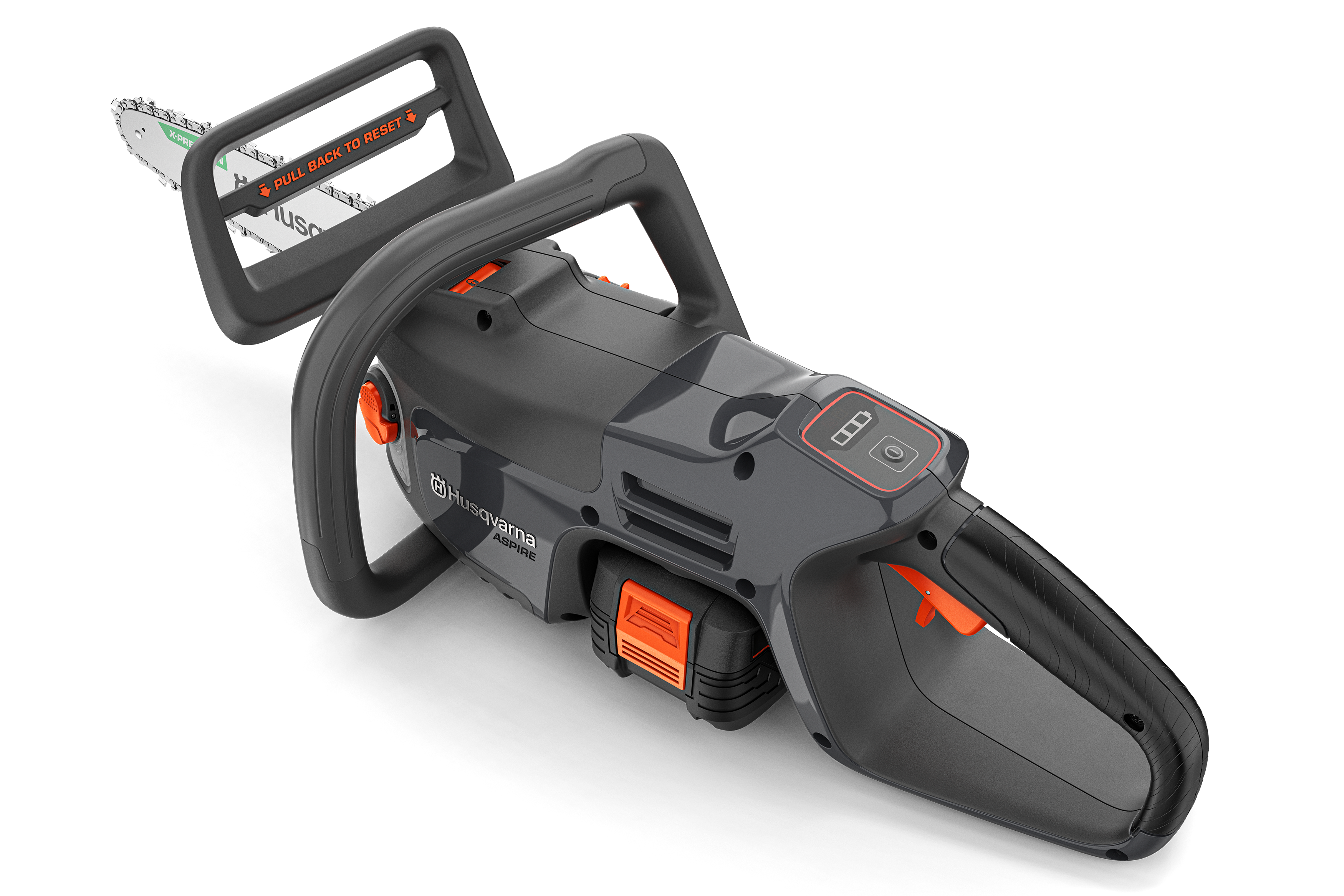 Aprīkots ar orientējošiem oranžiem mijiedarbības punktiem un automātisku izslēgšanos, ja 180 sekundes netiek izmantots, tādējādi samazinot traumu risku un pagarinot akumulatora darbības laiku. Lai līdz minimumam samazinātu nepieciešamo uzglabāšanas vietu, Aspire™ motorzāģis ir saderīgs ar Husqvarna uzglabāšanas risinājumu un ir aprīkots ar īpaši pielāgotu āķi ērtai uzglabāšanai pie sienas.